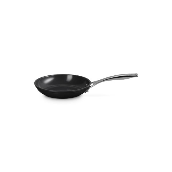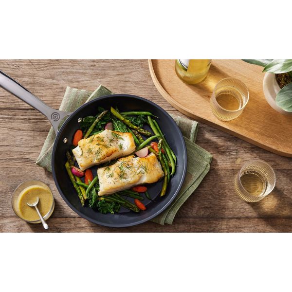 A trusted cooking companion for everything from searing to browning and more. With a heavy-gauge aluminum core and advanced ceramic coating made without PFAS, it distributes and retains heat efficiently, releases food with little to no added oil or fat, and wipes clean with ease.